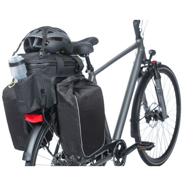 Op zoek naar een tas waarbij echt aan álles is gedacht? Dan is de Basil Miles XL Pro bagagedragertas jouw tas. De sportieve tas is waterdicht en heeft veel handige features. Zo heeft de tas twee waterdichte, uitklapbare zijtassen. Het bovenvak is ook uitbreidbaar. De inhoud van 9 liter is op deze manier uit te breiden naar maar liefst 36 liter. Verder heeft de tas een extra geïsoleerd vak voor een bidon en extra dividers, zodat je het hoofdvak kunt opdelen. Voor het koelhouden van eten en drinken zijn er twee vakken waar je koelelementen in kwijt kunt. In een extra vakje vind je een x-vorm elastiek. Dit elastiek kun je met kliksluitingen over een helm vastzetten. Zo neem je dus ook helm handig mee! Met de klittenbandbevestiging maak je de tas eenvoudig vast aan je bagagedrager. De sportieve bagagedragertas is eveneens geschikt voor MIK of Racktime adapterplaten. Deze platen zijn niet inbegrepen. De tas heeft een afneembare schouderband.
