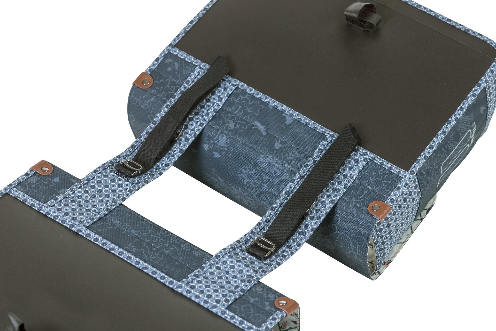 De Basil Bohème Double Bag is een dubbele blauwe fietstas met een stijlvolle bohemien print. Een fietsrit naar de supermarkt of een fietstrip met vriendinnen, deze fietstas maakt jouw fietsrit makkelijker en leuker. De groene tas heeft een inhoud van 35 liter waardoor je er meer dan genoeg boodschappen, sportspullen en andere benodigdheden in kwijt kan. De fietstas is geschikt voor diverse bagagedragers (ook e-bikes) en beschikt over stevige binnenvoering en kunstlederen details. Met behulp van het aansnoerkoord en de verstelbare kliksluitingen sluit de tas. Door het waterafstotende polyester blijft de inhoud van de tas droog bij een kleine regenbui. De reflectiedetails op beide kanten zorgen ervoor dat je beter zichtbaar bent in het donker. Dankzij het Universal Bridge systeem bevestig je de tas eenvoudig op je bagagedrager. Ook op de bagagedrager van je elektrische fiets. Het Universal Bridge systeem bestaat uit vier gleuven. Deze gleuven maken het mogelijk om de tas op twee manieren te bevestigen: Vaste montage: met behulp van de meegeleverde riempjes. Afneembaar: in combinatie met een adapterplaat. Geschikt voor adapterplaten van MIK en Racktime platen. Deze adapterplaten dien je apart aan te schaffen.