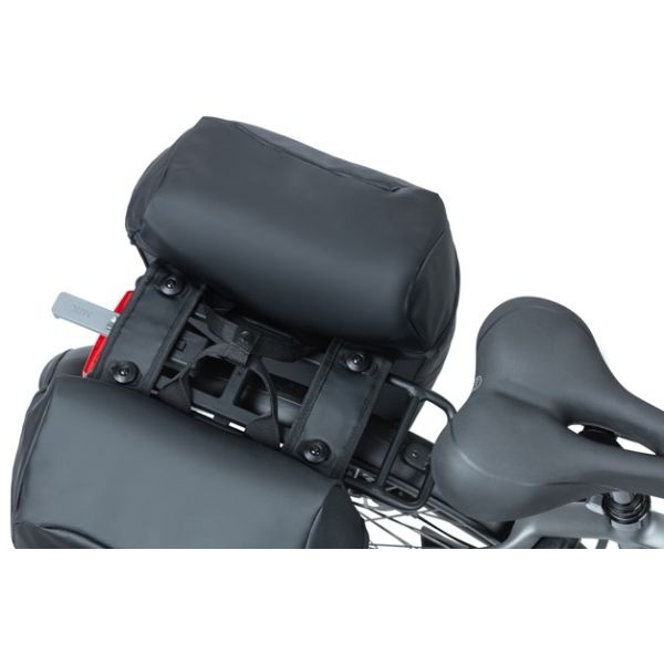 - Met een inhoud van maar liefst 34 liter kun je veel kwijt in de Basil Miles dubbele fietstas.
