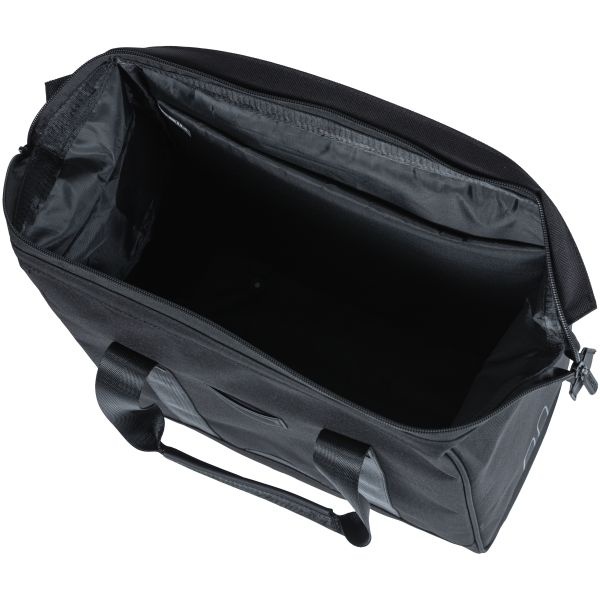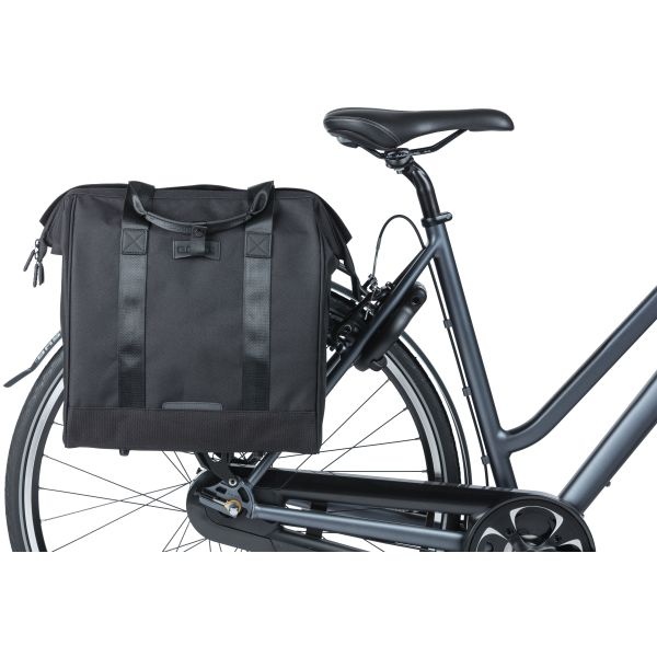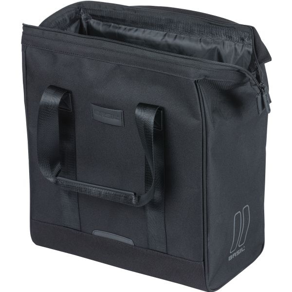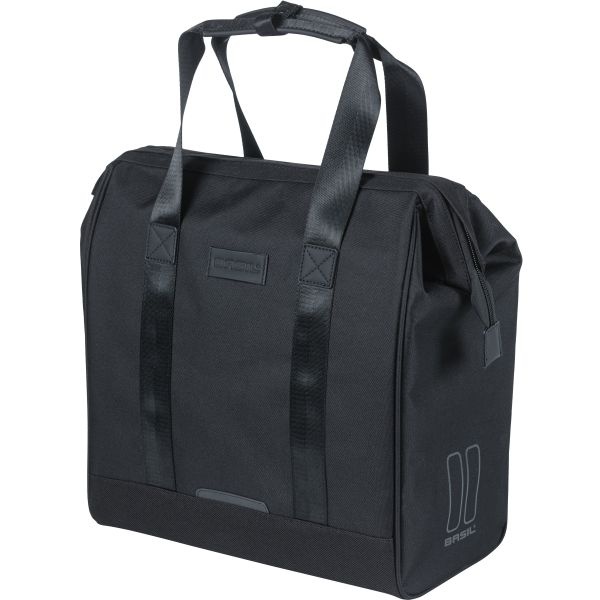 Met de Basil Grand fietsshopper wordt boodschappen of andere inkopen doen een feestje. Hij ziet er namelijk stijlvol en luxe uit, mede dankzij de zwarte kleur. Bovendien is hij gemaakt van waterafstotend 600D polyester en beschikt de shopper over een groot hoofdvak inclusief een gepolsterd (laptop)vak. Handig voor je studie aan de universiteit of voor je kantoorwerk. Met 23 liter inhoud kan je er dan ook de nodige boodschappen of andere spullen in kwijt. De tas is vormvast en dankzij de grootte kun je er met gemak pakken drinken staand in kwijt. De Basil Grand fietsshopper heeft een zogenaamde dokterssluiting, een extra grote opening zodat je de ruimte hebt voor het inpakken van de shopper. Je bevestigt de shopper aan je fiets met het Hook On systeem. Tip: ga je fietsen? Zet dan de handgrepen vast met het lusje aan het logo. Zo voorkom je dat de handgrepen gaan wapperen.