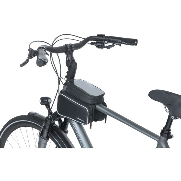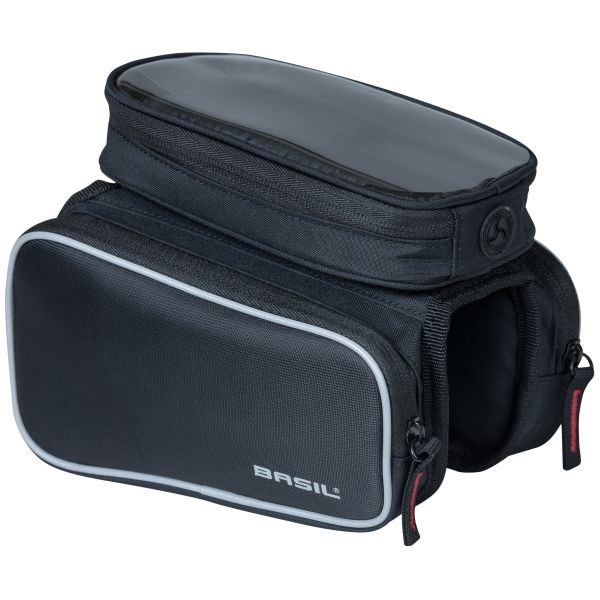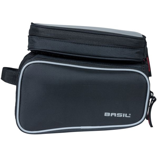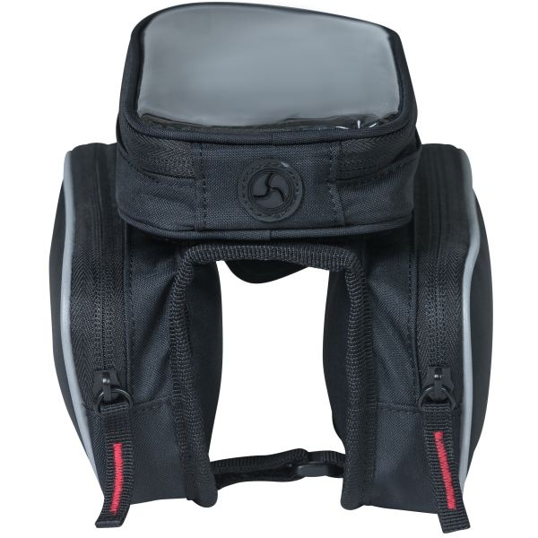De Basil Sport Design top tube frametas is perfect voor het maken van een recreatieve fietsricht. De sportieve zwarte tas heeft namelijk diverse handige features. Met een inhoud van 1,5 liter neem je kleine accessoires zoals je mobiel, sleutels of een bandenplaksetje mee. De tas bevestig je eenvoudig op de stang van je fiets door middel van klittenband. De tas kenmerkt zich door een sportief design en is gemaakt van waterafstotend polyester. De twee zijcompartimenten beschikken elk over een eigen binnenvak. Verder heeft de frametas een afneembaar boventasje waar plek is voor je smartphone. Je telefoon is gemakkelijk te bedienen dankzij een touchable venster en is er een opening aanwezig voor je oordopjes. Het reflectiemateriaal op de frametas maakt je beter zichtbaar in het donker, zodat je beter opvalt in het verkeer.