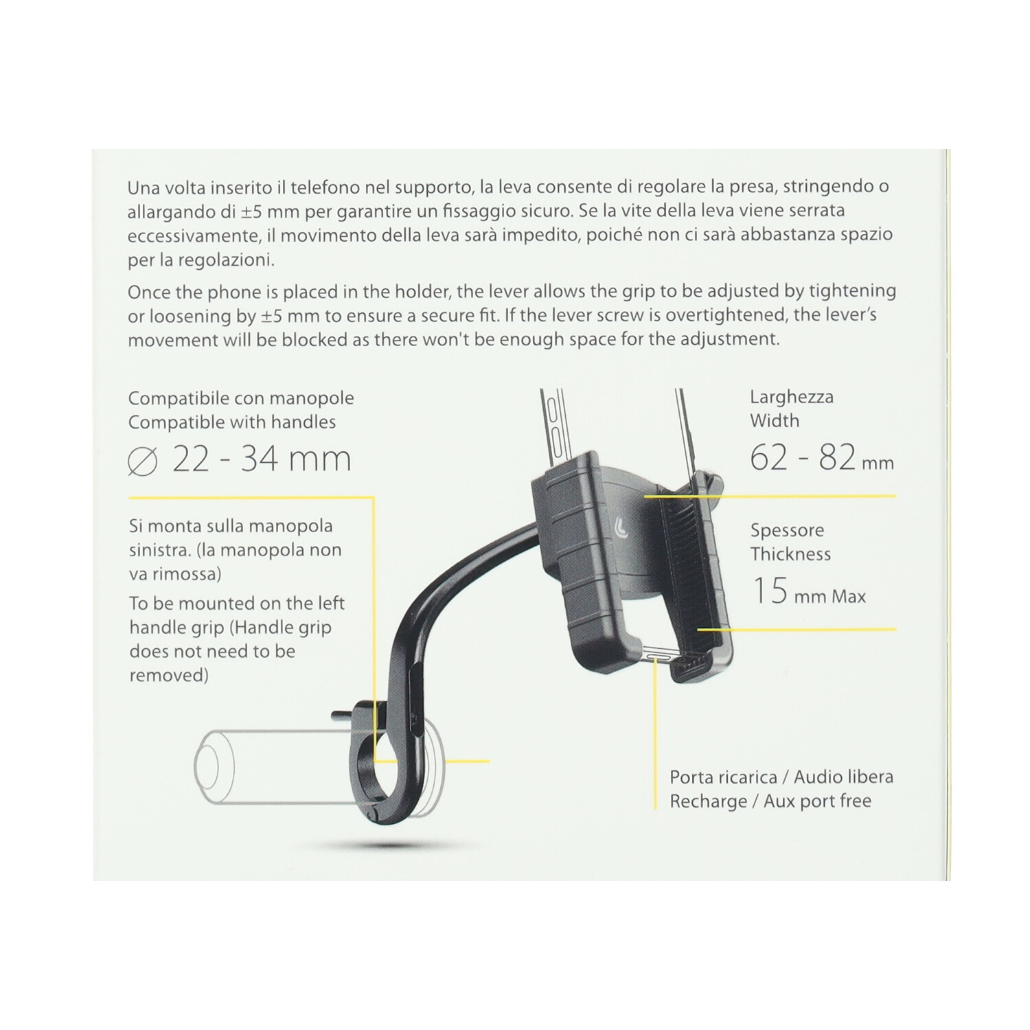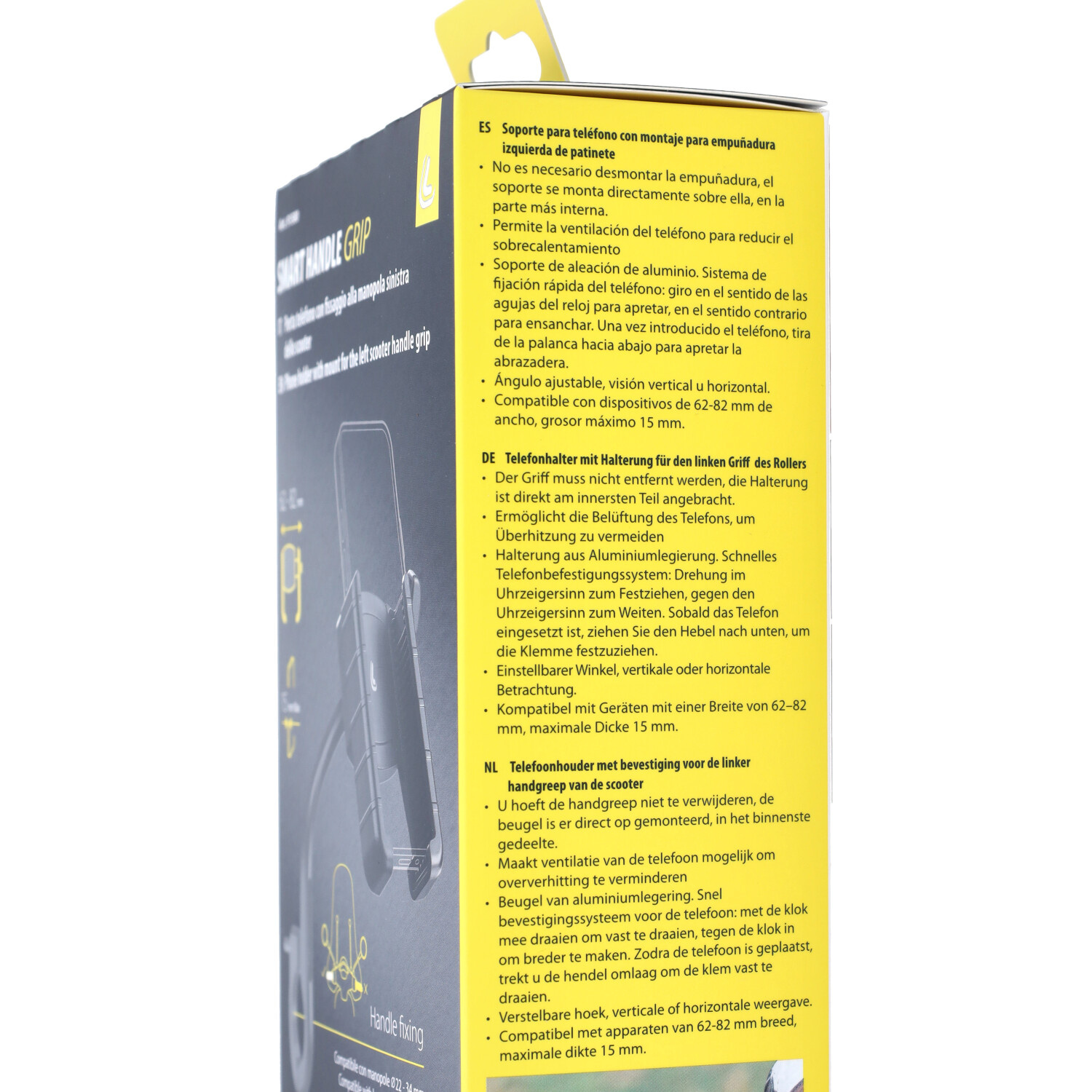 Het is niet nodig om de handgreep te verwijderen, de beugel is direct op de handgreep gemonteerd, in het binnenste gedeelte Schakelt de ventilatie van de telefoon in om oververhitting te verminderen Beugel van aluminiumlegering. Snel telefoonbevestigingssysteem. Verstelbare hoek, verticale of horizontale kijkhoek Geschikt voor apparaten met een breedte van 62-82 mm en een maximale dikte van 15 mm.