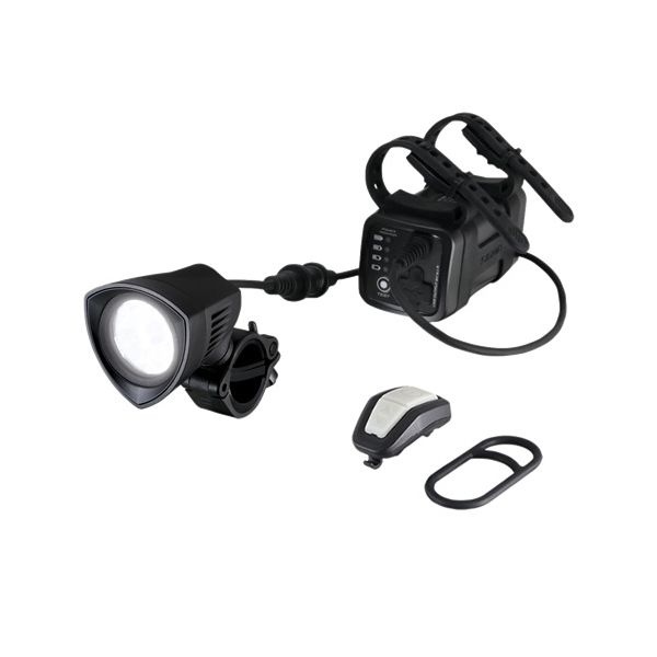 Afstandsbediening Met de 14 gram lichte en compacte afstandsbediening kan de BUSTER 2000 nog eenvoudiger bediend worden. Heel handig, wanneer de lamp op de helm is bevestigd. De draadloze afstandsbediening kan met een O-ring snel op het stuur worden aangebracht en dankzij fluorescerende knoppen ook in het donker snel gevonden worden. Deze werkt met een storingsvrij 2,4 GHz-signaal.