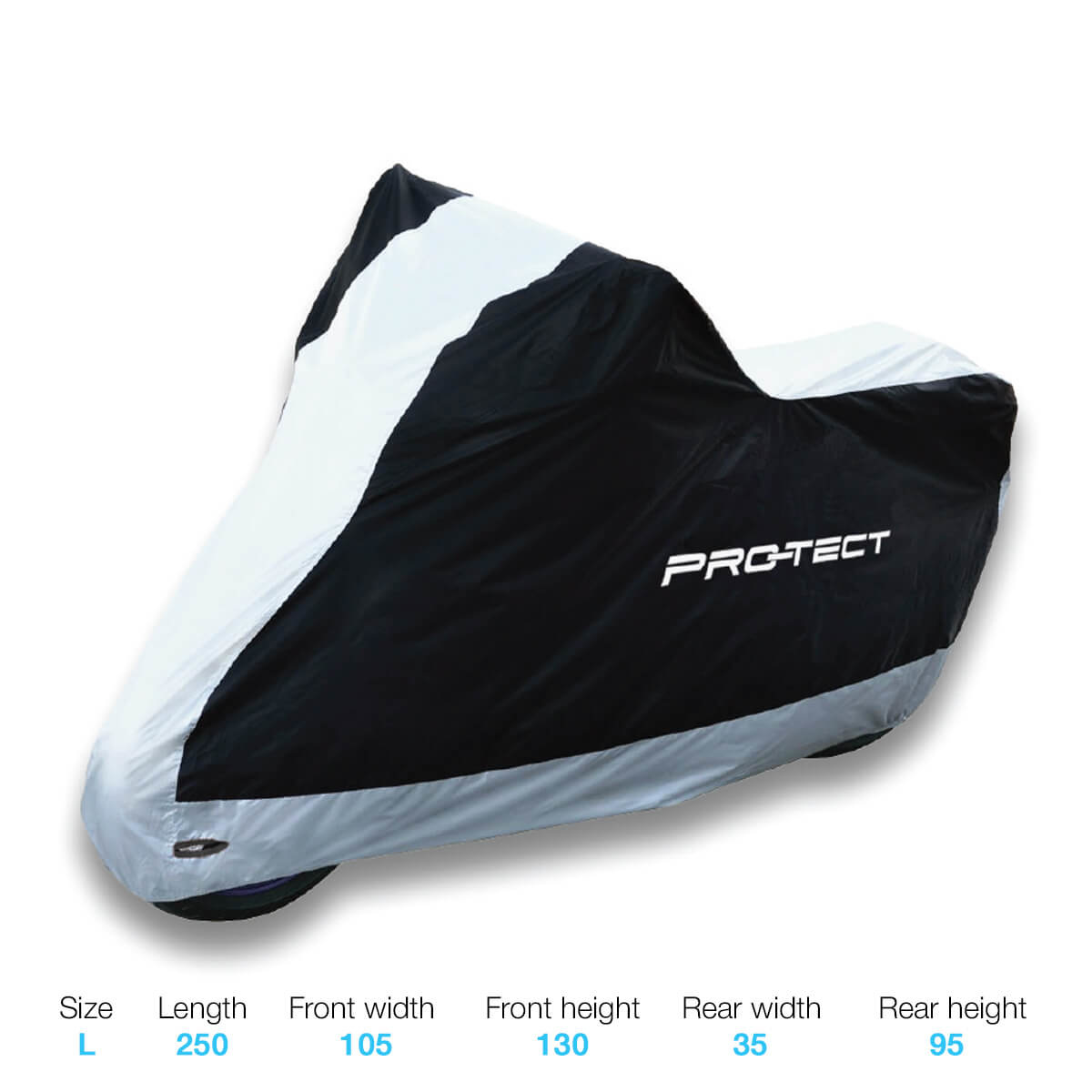 De vernieuwde Pro-tect motorhoes in maat L, is op alle vlakken verbeterd ten opzichte van zijn voorganger. Zo is de stof geüpgradede van 210T Taffeta naar 210D Oxford, deze stof is vele malen krachtiger en heeft een betere slijtvastheid, wat zorgt voor een langere levensduur. Daar bovenop is de hoes nu voorzien van een PU coating en hebben de dubbel gestikte naden een anti-water tape laag, wat de motorhoes waterdicht maakt. Hierdoor beschermd de hoes de motorfiets naast stof, vorst en UV nu ook tegen regen. De waterkolom is namelijk verhoogd van 400 mm (waterafstotend) naar 1500 mm (waterdicht).
