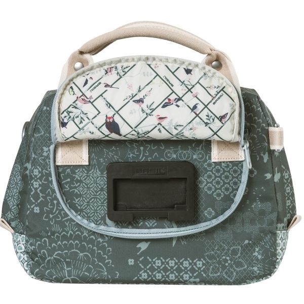 De Basil Bohème City bag is een elegante groene hand-, schouder- en stuurtas in èèn, met stijlvolle bohemien print. Een fietstochtje naar het terras in de stad of een dag winkelen met die vriendin, je kan al snel niet meer zonder deze Boheme City Bag. De tas heeft een stevige binnenvoering, een ritsvak en een inhoud van 8 liter. Ruimte genoeg voor je portemonnee, een flesje water en andere benodigdheden. Door het waterafstotende polyester blijven je spullen droog tijdens een kleine regenbui. De kunstlederen details en de vrolijke bohemien print met grafische kruissteekpatroon en vogelsilhouetten, zorgen voor een trendy uitstraling. Door het afneembare schouderhengsel, is de tas ook als schoudertas te dragen. De tas is vast te maken dankzij de voorgemonteerde Basil KF adapterplaat. Daarmee klik je de tas eenvoudig op bijvoorbeeld de Basil KF stuurbochthouder. Dit systeem is niet inbegrepen. In het donker ben je beter zichtbaar door de reflectiedetails. De Basil Boheme City Bag is verkrijgbaar in meerdere kleuren waaronder rood en blauw. De tas is onderdeel van de Basil Boheme collectie. Zo heeft deze Boheme lijn ook een dubbele tas, een grotere enkele tas en bijpassende fietsaccessoires.