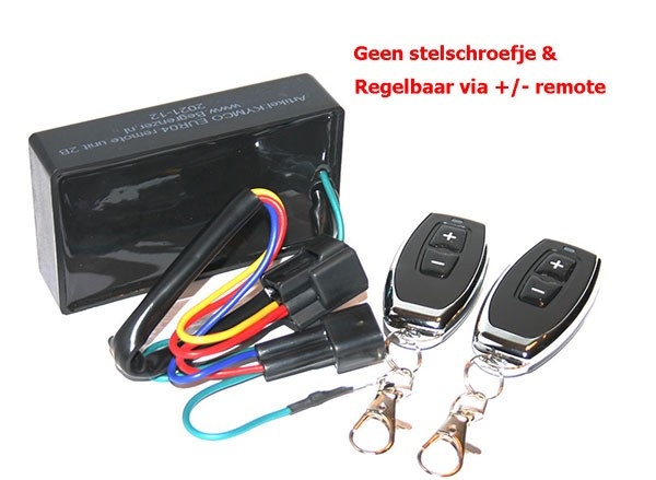 Regelbare Remote-begrenzer voor Kymco Injectie (afstandsbediening) E3/4/5. Variabele Begrensde snelheid in te stellen tussen 0-de max van betreffende scooter via de afstandsbediening, dus geen stelschroefje meer. LET op! Setje is niet om mee op te voeren, hiervoor dient gladde bus en kymco software gebruikt te worden. Bij snor moet spruitstukgroter worden geboord. Begrenzer is plug and play op de bobine en losse massadraad aansluiten. Werking: (+) knop= snelheid omhoog (- ) knop= snelheid omlaag (+ en -) tegelijk indrukken= onbegrensd! Motor uit en aan (tijdens rijden ook!) dan weer begrensd. Motor hoeft niet uit te vallen! Geschikt voor: Kymco Agility 16+ E4/E5 , New People S E4/E5, New Sento E3/E4, New Like (special) E4/E5, Super 8 E4 (E5), VP50 E4, Carry E4/E5 en Delivery E4/E5. (Niet geschikt voor Kymco Agility 12” E3/E4/E5, gebruik KYMCO Agility E3/E4/E5 e-cab begrenzer)