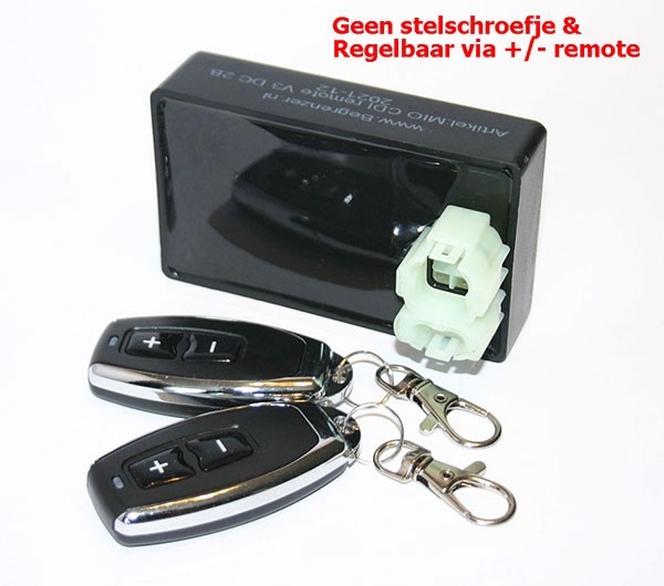 Snelle CDI voor SYM MIO 4T E2 regelbaar via de afstandsbediening. Variabele Begrensde snelheid in te stellen tussen 0-de max van betreffende scooter via de afstandsbediening, dus geen stelschroefje meer. Werking: (+) knop= snelheid omhoog (- ) knop= snelheid omlaag (+ en -) tegelijk indrukken= onbegrensd! Motor uit en aan (tijdens rijden ook!) dan weer begrensd. Motor hoeft niet uit te vallen! Geschikt voor: SYM MIO 4T E2