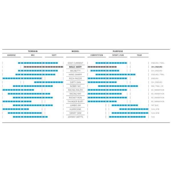 MAGIC MARY DE ULTIEME GRAVITY BAND. Onbetwist de favoriet van alle Schwalbe Downhill- en Enduro-atleten. Perfecte allround-eigenschappen voor bijna alle ondergronden en condities. Het geraffineerde intermediaite profiel wordt gecombineerd met de beste compounds en constructie en verlegt daarmee de grenzen tot ongekende hoogte.